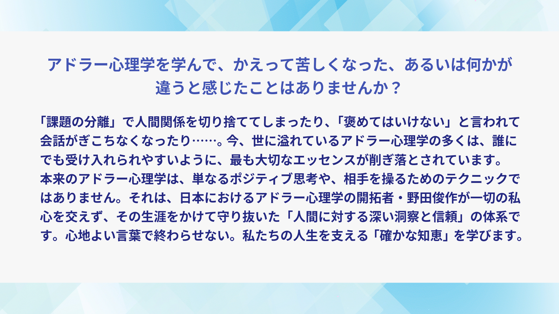 また、これまでに何らかの形でアドラー心理学を学んでこられた方が、知識を整理・点検するためにも大変役立ちます。書物で独学を続けてこられた方にとっても、アドラー心理学を日常に活かす実践的な使い方が学べるため、得るところがとても大きいでしょう