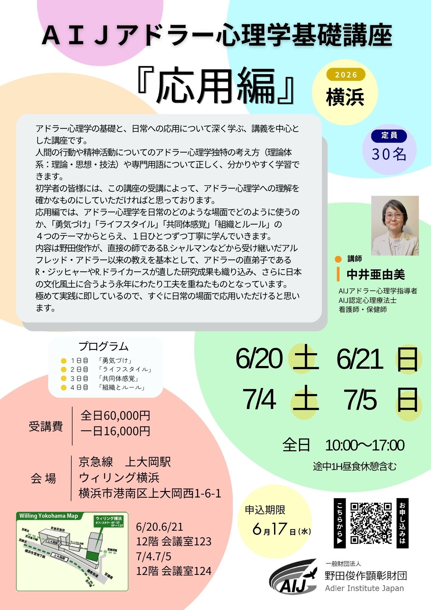AIJアドラー心理学基礎講座応用編:横浜(神奈川県) 行事詳細 この行事は 2026年6月20日 から 2026年7月5日 まで開催されます。次回の開催は 2026年6月20日 です。 会場: ウィリング横浜 種類: 基礎講座, 講座C, 関東 タグ: 神奈川県 開催日: 2026年6月20日2026年6月21日2026年7月4日2026年7月5日 主催:一般財団法人 野田俊作顕彰財団 Adler Institute Japan 講師:AIJ アドラー心理学指導者 中井亜由美 申し込み:申込受付中 日程:6月20日(土)、21日(日)、7月4日(土)、5日(日) 時刻:午前10時~午後5時 開催場所:ウィリング横浜 横浜市港南区上大岡西1-6-16月20日、21日 会議室123 7月4日、5日 会議室124 受講料:全日参加 60,000円一日参加 16,000円 定員:30名 お問い合わせ先:info@adler.or.jp オンラインで上記講座を申し込む 上記講座の申込用紙を開く