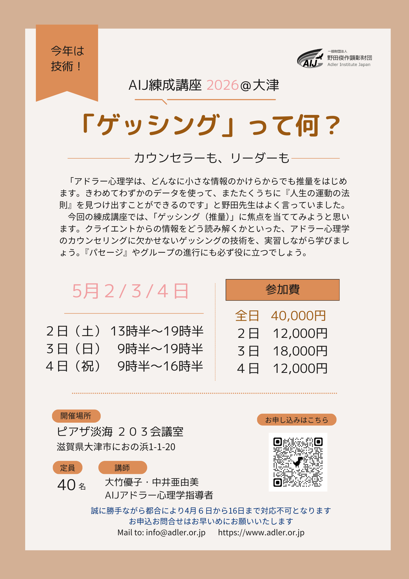 AIJアドラー心理学練成講座:大津(滋賀県) 行事詳細 この行事は 2026年5月2日 から 2026年5月4日 まで開催されます。次回の開催は 2026年5月2日 です。 種類: 練成講座, 近畿 タグ: 滋賀県 開催日: 2026年5月2日2026年5月3日2026年5月4日 主催:一般財団法人 野田俊作顕彰財団 Adler Institute Japan お申し込み:準備中 日程:5月2日(土)、3日(日)、4日(月) お問い合わせ先:info@adler.or.jp