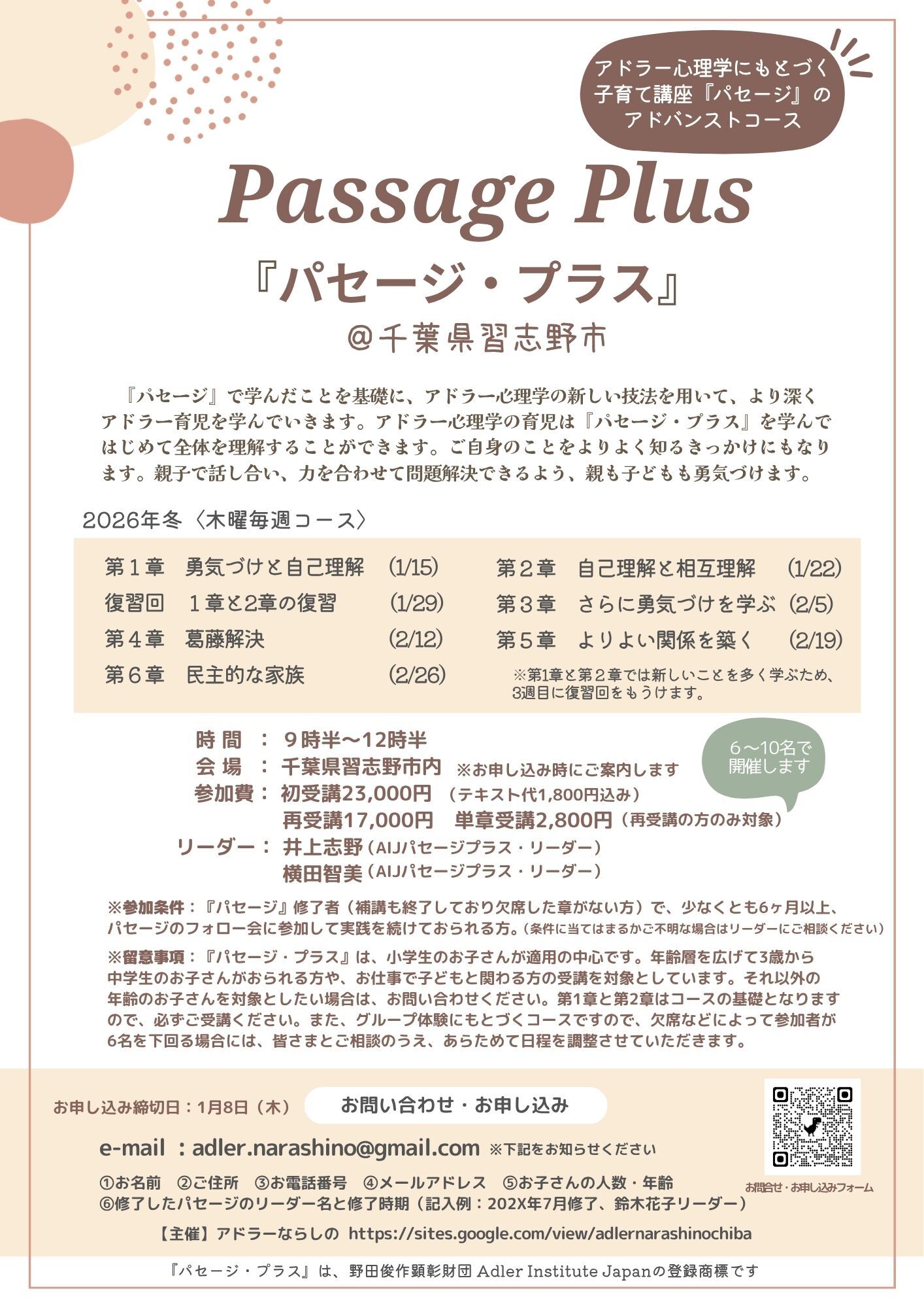 パセージ・プラス習志野(千葉県) 行事詳細 この行事は 2026年1月15日 から 2026年2月26日 まで開催されます。次回の開催は 2026年1月15日 9:30 AM です。 会場: プラッツ習志野 中央公民館 種類: パセージプラス, 関東 タグ: 井上志野リーダー, 千葉県, 横田智美リーダー 開催日: 2026年1月15日 9:30 AM – 12:30 PM2026年1月22日 9:30 AM – 12:30 PM2026年1月29日 9:30 AM – 12:30 PM2026年2月5日 9:30 AM – 12:30 PM2026年2月12日 9:30 AM – 12:30 PM2026年2月19日 9:30 AM – 12:30 PM2026年2月26日 9:30 AM – 12:30 PM リーダー名:井上志野(AIJパセージプラス・リーダー)横田智美(AIJパセージプラス・リーダー) 日程:2026年1月15日、22日、29日2月5日、12日、19日、26日(全日木曜日) 時間:9:30~12:30 会場:プラッツ習志野 中央公民館(千葉県習志野市) お申し込み先:adler.narashino@gmail.com ホームページ:https://sites.google.com/view/adlernarashinochiba