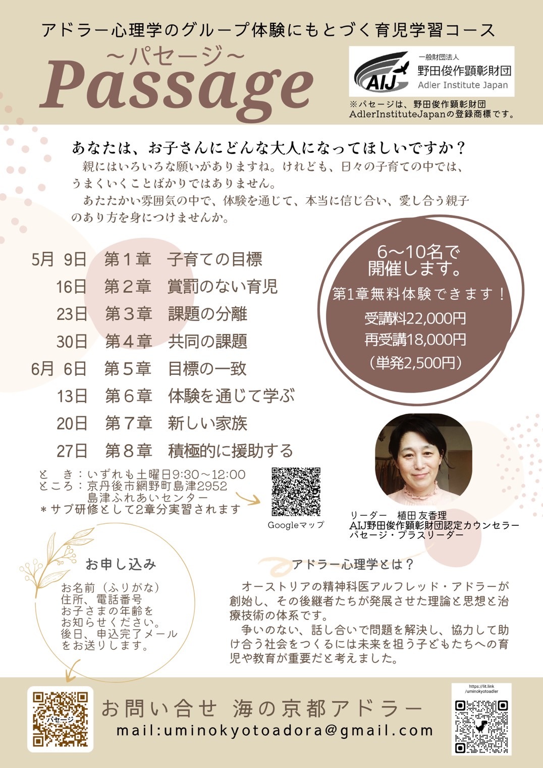パセージ京丹後(京都府) 行事詳細 この行事は 2026年5月9日 から 2026年6月27日 まで開催されます。次回の開催は 2026年5月9日 9:30 AM です。 会場: 島津ふれあいセンター 種類: パセージ, 近畿 タグ: 京都府, 植田友香理リーダー 開催日: 2026年5月9日 9:30 AM – 12:00 PM2026年5月16日 9:30 AM – 12:00 PM2026年5月23日 9:30 AM – 12:00 PM2026年5月30日 9:30 AM – 12:00 PM2026年6月6日 9:30 AM – 12:00 PM2026年6月13日 9:30 AM – 12:00 PM2026年6月20日 9:30 AM – 12:00 PM2026年6月27日 9:30 AM – 12:00 PM リーダー名:植田友香理(AIJパセージ・リーダー) 開催日:5月9日、16日、23日、30日、6月6日、13日、20日、27日(毎週土曜日) 開催時間:9:30~12:00 開催場所:京都府京丹後市網野町字島津2952 「島津ふれあいセンター」 お申し込み先:uminokyotoadora@gmail.com