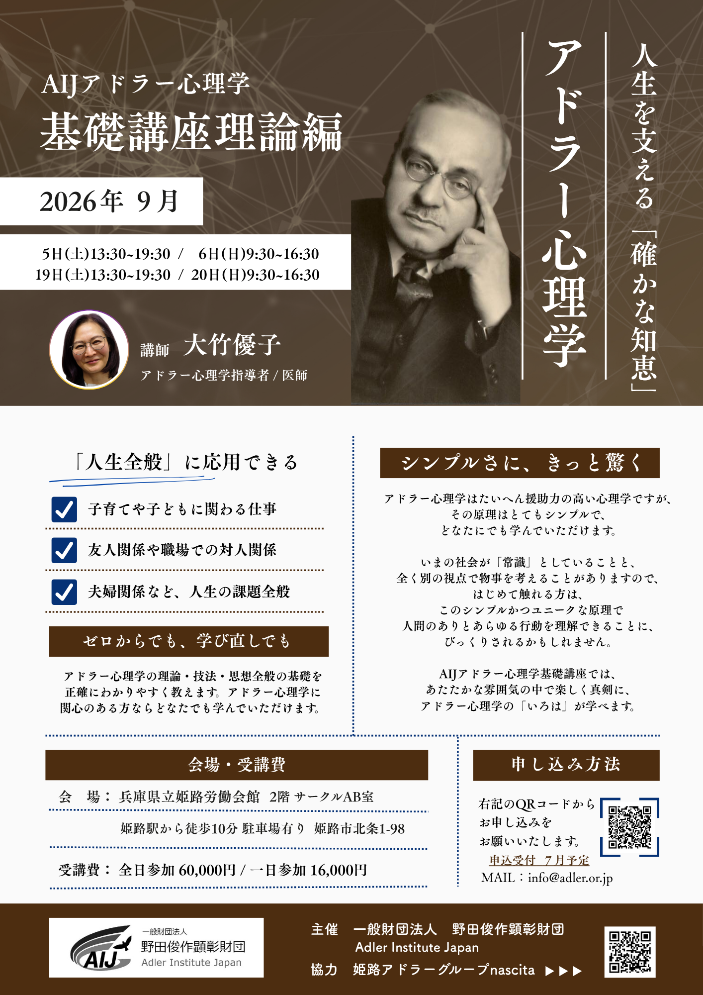 - 主催:一般財団法人 野田俊作顕彰財団 Adler Institute Japan